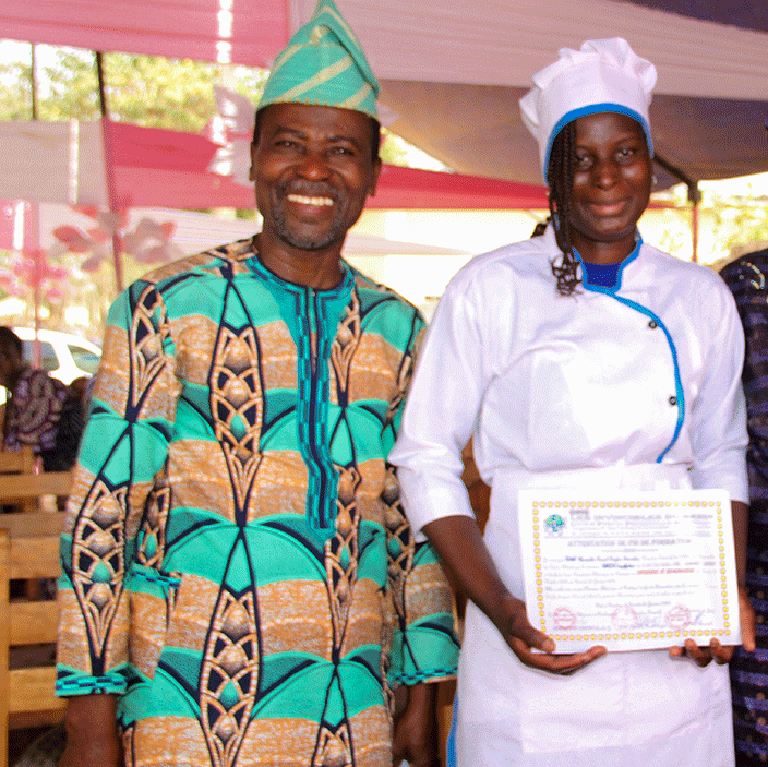 Madame ASSANGOUNON GNAHOUI Armelle Épouse TOHA est la Présidente du Conseil d’administration et formatrice en Cuisine Restauration et Pâtisserie Boulangerie.