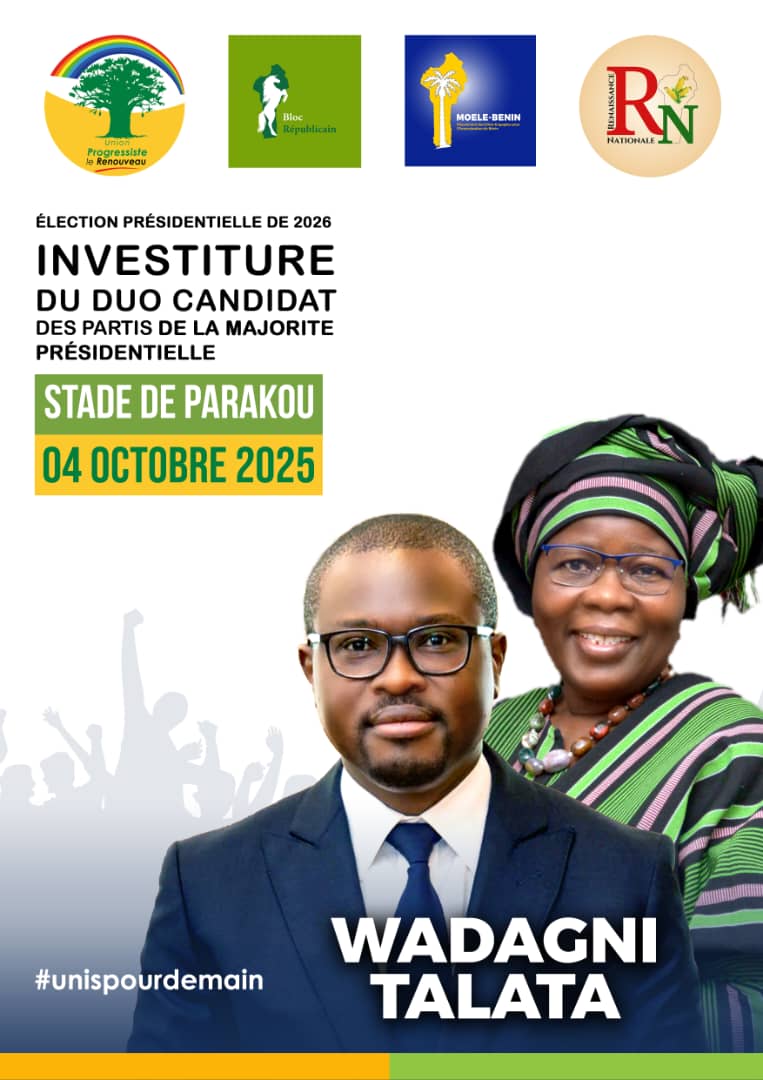 Au Bénin, le stade municipal de Parakou situé dans le département du Borgou, acceuille Samedi 4 Octobre 2025, la cérémonie officielle d’investiture du duo Romuald Wadagni et Mariam Chabi Talata Zimé Yérima, candidats de la mouvance présidentielle pour les élections présidentielles du 12 Avril 2026.