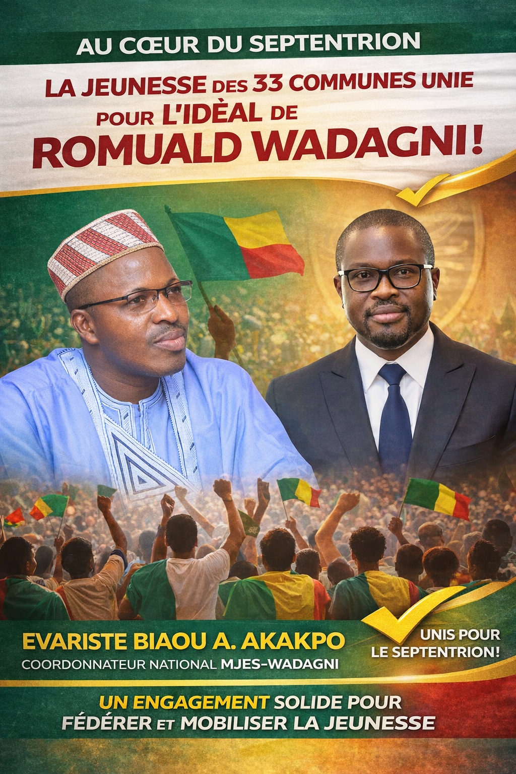 Sous la coordination nationale d’Evariste Biaou A. Akakpo, le mouvement entend fédérer les énergies juvéniles autour d’une vision axée sur le développement, la rigueur dans la gestion publique et la promotion des opportunités pour la jeunesse. Pour les responsables du MJES-WADAGNI, il s’agit avant tout d’un engagement citoyen, fondé sur la conviction que la jeunesse doit jouer un rôle central dans la consolidation des acquis et la construction de nouvelles perspectives économiques et sociales.