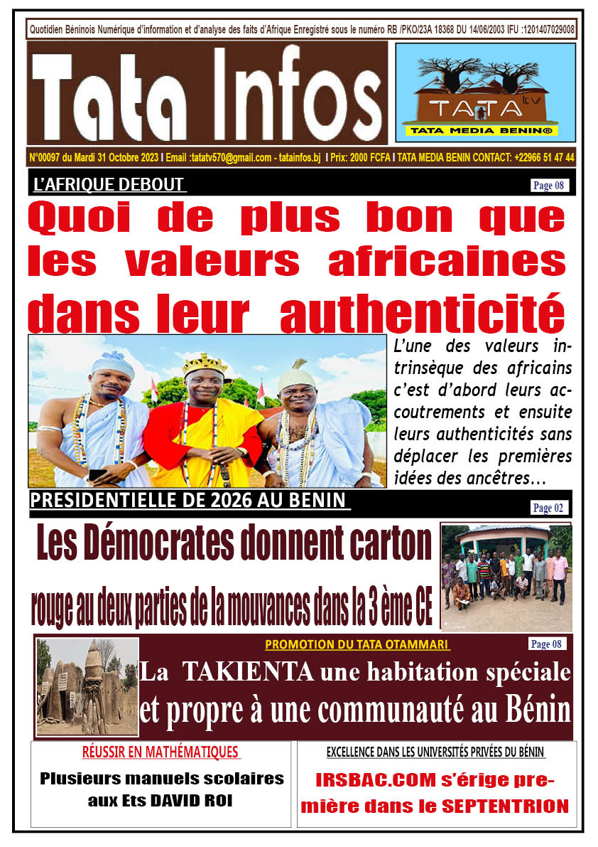 Actualité Revue de presse la une du journal tatainfos 31 octobre 2023 Spread the loverecevez la une du jounale de ce mardi 31 octobre 2023 Navigation d’article Précédent la une du journalSuivant L’He Théophile M’PO N’TIA et ses collègues députés élevés dans l’ordre national du Bénin : Des leaders exemplaires célébrés pour leur engagement exceptionnel Laisser un commentaire Annuler la réponseVotre adresse e-mail ne sera pas publiée. Les champs obligatoires sont indiqués avec *Commentaire * Nom * E-mail * Site web Enregistrer mon nom, mon e-mail et mon site dans le navigateur pour mon prochain commentaire. Δ Histoires connexes Le Nouveau Diplomate, nouveau carrefour du reggae à Parakou ce samedi Actualité Annonces Culture Le Nouveau Diplomate, nouveau carrefour du reggae à Parakou ce samedi 22 janvier 2026 Bénin : 21 nominations prononcées aux ministères de la Justice et du Numérique Actualité Nationale Bénin : 21 nominations prononcées aux ministères de la Justice et du Numérique 21 janvier 2026 Présidentielle au Bénin : les deux duos désormais fixés sur leur position sur le bulletin de vote Actualité Politique Présidentielle au Bénin : les deux duos désormais fixés sur leur position sur le bulletin de vote 21 janvier 2026