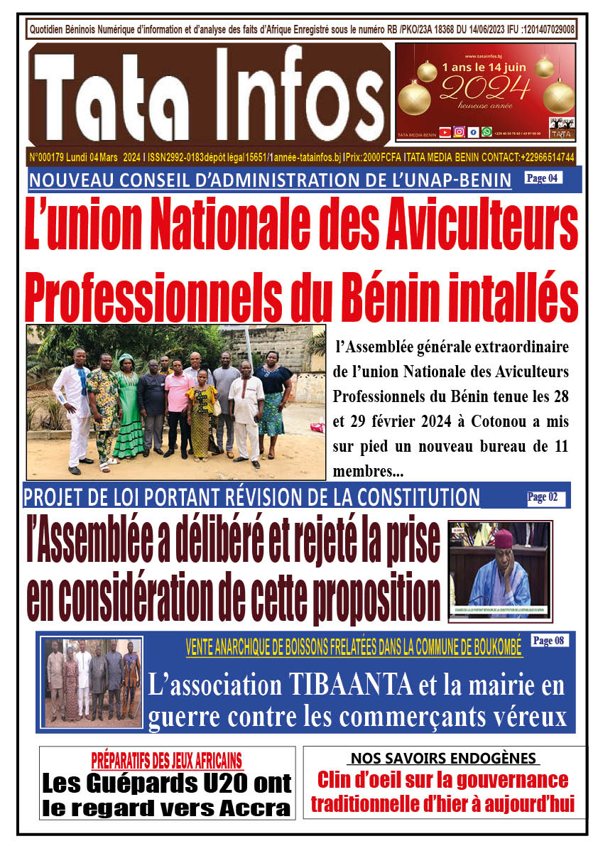 Actualité Revue de presse la une du journal de ce lundi 04 Mars 2024 tatainfos 3 mars 2024 Spread the love Navigation d’article Précédent Renforcement de l’offre touristique dans la région du septentrion : L’hôtel Tata Somba entièrement rénové et remis en service à NatitingouSuivant OURNÉE INTERNATIONALE DES DROITS DE LA FEMME Laisser un commentaire Annuler la réponseVotre adresse e-mail ne sera pas publiée. Les champs obligatoires sont indiqués avec *Commentaire * Nom * E-mail * Site web Enregistrer mon nom, mon e-mail et mon site dans le navigateur pour mon prochain commentaire. Δ Histoires connexes Le Nouveau Diplomate, nouveau carrefour du reggae à Parakou ce samediParakou vibrera au rythme du reggae ce samedi 24 janvier 2026. Le bar-restaurant Le Nouveau Diplomate, situé au quartier Arafat non loin du marché Tchakitibam, organise une grande soirée reggae live à partir de 20 heures, ouverte au grand public. Pour l’occasion, le Bénin Reggae Band sera à l’honneur, accompagné de plusieurs artistes de la scène reggae locale. Les voix de Ludolph, Fidèle, Jo-Rass et Djah Lil viendront enrichir ce live show, promettant un voyage musical entre titres engagés, mélodies apaisantes et sonorités roots, fidèles à l’âme du reggae. L’accès à la soirée est libre, avec une consommation obligatoire. Une légère majoration de 100 francs CFA sera appliquée sur les boissons, afin de soutenir l’organisation de l’événement et les artistes invités. À travers cette initiative, Le Nouveau Diplomate réaffirme son engagement en faveur de la promotion de la musique live et de la valorisation des talents locaux. Cette soirée reggae s’annonce comme un véritable moment de partage, de détente et de découverte pour les amoureux de bonne musique, dans une ambiance chaleureuse et festive. Un rendez-vous à ne pas manquer pour tous les passionnés de reggae et de culture urbaine à Parakou. Actualité Annonces Culture Le Nouveau Diplomate, nouveau carrefour du reggae à Parakou ce samediParakou vibrera au rythme du reggae ce samedi 24 janvier 2026. Le bar-restaurant Le Nouveau Diplomate, situé au quartier Arafat non loin du marché Tchakitibam, organise une grande soirée reggae live à partir de 20 heures, ouverte au grand public. Pour l’occasion, le Bénin Reggae Band sera à l’honneur, accompagné de plusieurs artistes de la scène reggae locale. Les voix de Ludolph, Fidèle, Jo-Rass et Djah Lil viendront enrichir ce live show, promettant un voyage musical entre titres engagés, mélodies apaisantes et sonorités roots, fidèles à l’âme du reggae. L’accès à la soirée est libre, avec une consommation obligatoire. Une légère majoration de 100 francs CFA sera appliquée sur les boissons, afin de soutenir l’organisation de l’événement et les artistes invités. À travers cette initiative, Le Nouveau Diplomate réaffirme son engagement en faveur de la promotion de la musique live et de la valorisation des talents locaux. Cette soirée reggae s’annonce comme un véritable moment de partage, de détente et de découverte pour les amoureux de bonne musique, dans une ambiance chaleureuse et festive. Un rendez-vous à ne pas manquer pour tous les passionnés de reggae et de culture urbaine à Parakou. 22 janvier 2026 Bénin : 21 nominations prononcées aux ministères de la Justice et du Numérique Actualité Nationale Bénin : 21 nominations prononcées aux ministères de la Justice et du Numérique 21 janvier 2026 Présidentielle au Bénin : les deux duos désormais fixés sur leur position sur le bulletin de vote Actualité Politique Présidentielle au Bénin : les deux duos désormais fixés sur leur position sur le bulletin de vote 21 janvier 2026