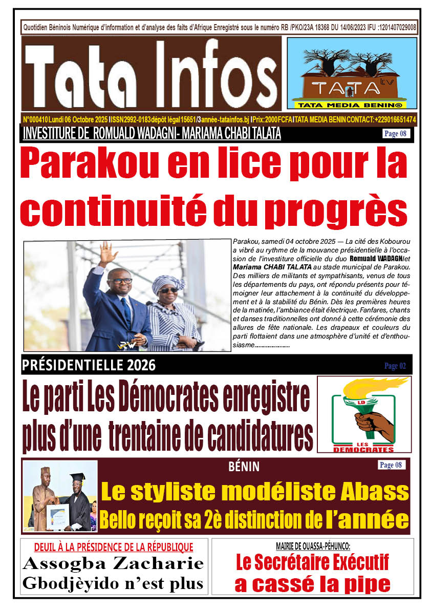 Actualité Nationale Revue de presse la une du journal de ce lundi 06 Octobre 2025 tatainfos 5 octobre 2025 Spread the love Navigation d’article Précédent Investiture du duo Wadagni-Talata à Parakou : Tout est fin prêt pour le grand démarrageSuivant Parakou, le souffle d’un nouvel espoir – Investiture du duo Wadagni–Talata pour la présidentielle de 2026 Laisser un commentaire Annuler la réponseVotre adresse e-mail ne sera pas publiée. Les champs obligatoires sont indiqués avec *Commentaire * Nom * E-mail * Site web Enregistrer mon nom, mon e-mail et mon site dans le navigateur pour mon prochain commentaire. Δ Histoires connexes Bénin : 21 nominations prononcées aux ministères de la Justice et du Numérique Actualité Nationale Bénin : 21 nominations prononcées aux ministères de la Justice et du Numérique 21 janvier 2026 Présidentielle au Bénin : les deux duos désormais fixés sur leur position sur le bulletin de vote Actualité Politique Présidentielle au Bénin : les deux duos désormais fixés sur leur position sur le bulletin de vote 21 janvier 2026 LA UNE DU JOURNAL DE CE MERCREDI 21 JANVIER 2026 Actualité Revue de presse LA UNE DU JOURNAL DE CE MERCREDI 21 JANVIER 2026 20 janvier 2026