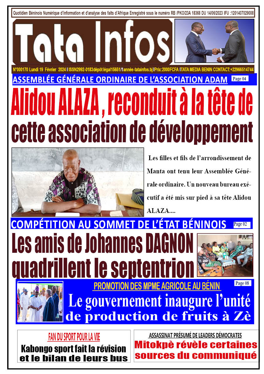 Actualité Revue de presse la une du journal de ce lundi 19 Février 2024 tatainfos 18 février 2024 Spread the love Navigation d’article Précédent Promotion des MPME agricoles au Bénin : Le Gouvernement inaugure l’unité de production de jus de fruits de « Bio PHARM » à ZèSuivant TOUT SAVOIR SUR L’HOMME : Johannes Dagnon, tête pensante de Patrice Talon Laisser un commentaire Annuler la réponseVotre adresse e-mail ne sera pas publiée. Les champs obligatoires sont indiqués avec *Commentaire * Nom * E-mail * Site web Enregistrer mon nom, mon e-mail et mon site dans le navigateur pour mon prochain commentaire. Δ Histoires connexes Le Nouveau Diplomate, nouveau carrefour du reggae à Parakou ce samediParakou vibrera au rythme du reggae ce samedi 24 janvier 2026. Le bar-restaurant Le Nouveau Diplomate, situé au quartier Arafat non loin du marché Tchakitibam, organise une grande soirée reggae live à partir de 20 heures, ouverte au grand public. Pour l’occasion, le Bénin Reggae Band sera à l’honneur, accompagné de plusieurs artistes de la scène reggae locale. Les voix de Ludolph, Fidèle, Jo-Rass et Djah Lil viendront enrichir ce live show, promettant un voyage musical entre titres engagés, mélodies apaisantes et sonorités roots, fidèles à l’âme du reggae. L’accès à la soirée est libre, avec une consommation obligatoire. Une légère majoration de 100 francs CFA sera appliquée sur les boissons, afin de soutenir l’organisation de l’événement et les artistes invités. À travers cette initiative, Le Nouveau Diplomate réaffirme son engagement en faveur de la promotion de la musique live et de la valorisation des talents locaux. Cette soirée reggae s’annonce comme un véritable moment de partage, de détente et de découverte pour les amoureux de bonne musique, dans une ambiance chaleureuse et festive. Un rendez-vous à ne pas manquer pour tous les passionnés de reggae et de culture urbaine à Parakou. Actualité Annonces Culture Le Nouveau Diplomate, nouveau carrefour du reggae à Parakou ce samediParakou vibrera au rythme du reggae ce samedi 24 janvier 2026. Le bar-restaurant Le Nouveau Diplomate, situé au quartier Arafat non loin du marché Tchakitibam, organise une grande soirée reggae live à partir de 20 heures, ouverte au grand public. Pour l’occasion, le Bénin Reggae Band sera à l’honneur, accompagné de plusieurs artistes de la scène reggae locale. Les voix de Ludolph, Fidèle, Jo-Rass et Djah Lil viendront enrichir ce live show, promettant un voyage musical entre titres engagés, mélodies apaisantes et sonorités roots, fidèles à l’âme du reggae. L’accès à la soirée est libre, avec une consommation obligatoire. Une légère majoration de 100 francs CFA sera appliquée sur les boissons, afin de soutenir l’organisation de l’événement et les artistes invités. À travers cette initiative, Le Nouveau Diplomate réaffirme son engagement en faveur de la promotion de la musique live et de la valorisation des talents locaux. Cette soirée reggae s’annonce comme un véritable moment de partage, de détente et de découverte pour les amoureux de bonne musique, dans une ambiance chaleureuse et festive. Un rendez-vous à ne pas manquer pour tous les passionnés de reggae et de culture urbaine à Parakou. 22 janvier 2026 Bénin : 21 nominations prononcées aux ministères de la Justice et du Numérique Actualité Nationale Bénin : 21 nominations prononcées aux ministères de la Justice et du Numérique 21 janvier 2026 Présidentielle au Bénin : les deux duos désormais fixés sur leur position sur le bulletin de vote Actualité Politique Présidentielle au Bénin : les deux duos désormais fixés sur leur position sur le bulletin de vote 21 janvier 2026