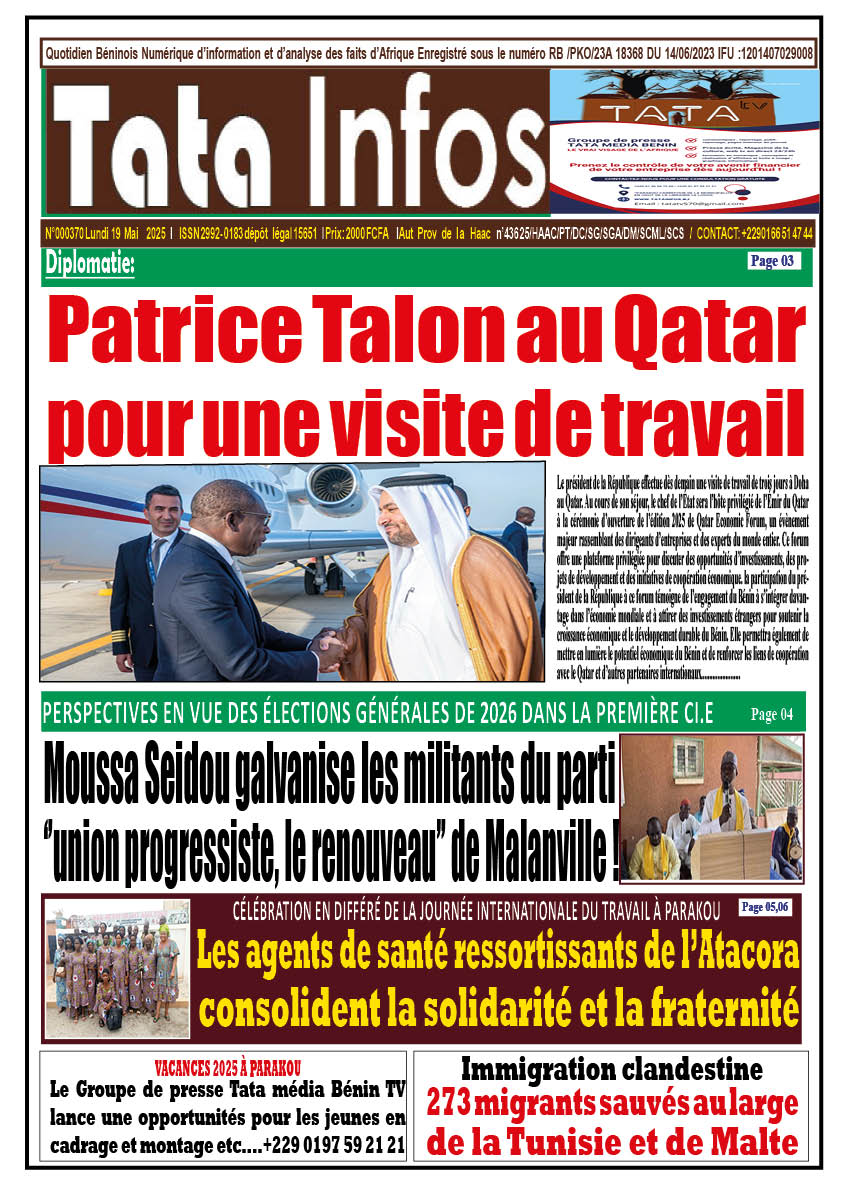 Actualité ANALYSES & INTERVIEWS Revue de presse la une du journal de ce lundi 19 mai 2025 tatainfos 18 mai 2025 Spread the love Navigation d’article Précédent Diplomatie: Patrice Talon au Qatar pour une visite de travail.Suivant CÉLÉBRATION EN DIFFÉRÉ DE LA JOURNÉE INTERNATIONALE DU TRAVAIL À PARAKOU : Les agents de santé ressortissants de l’Atacora consolident la solidarité et la fraternité Laisser un commentaire Annuler la réponseVotre adresse e-mail ne sera pas publiée. Les champs obligatoires sont indiqués avec *Commentaire * Nom * E-mail * Site web Enregistrer mon nom, mon e-mail et mon site dans le navigateur pour mon prochain commentaire. Δ Histoires connexes Bénin : 21 nominations prononcées aux ministères de la Justice et du Numérique Actualité Nationale Bénin : 21 nominations prononcées aux ministères de la Justice et du Numérique 21 janvier 2026 Présidentielle au Bénin : les deux duos désormais fixés sur leur position sur le bulletin de vote Actualité Politique Présidentielle au Bénin : les deux duos désormais fixés sur leur position sur le bulletin de vote 21 janvier 2026 LA UNE DU JOURNAL DE CE MERCREDI 21 JANVIER 2026 Actualité Revue de presse LA UNE DU JOURNAL DE CE MERCREDI 21 JANVIER 2026 20 janvier 2026