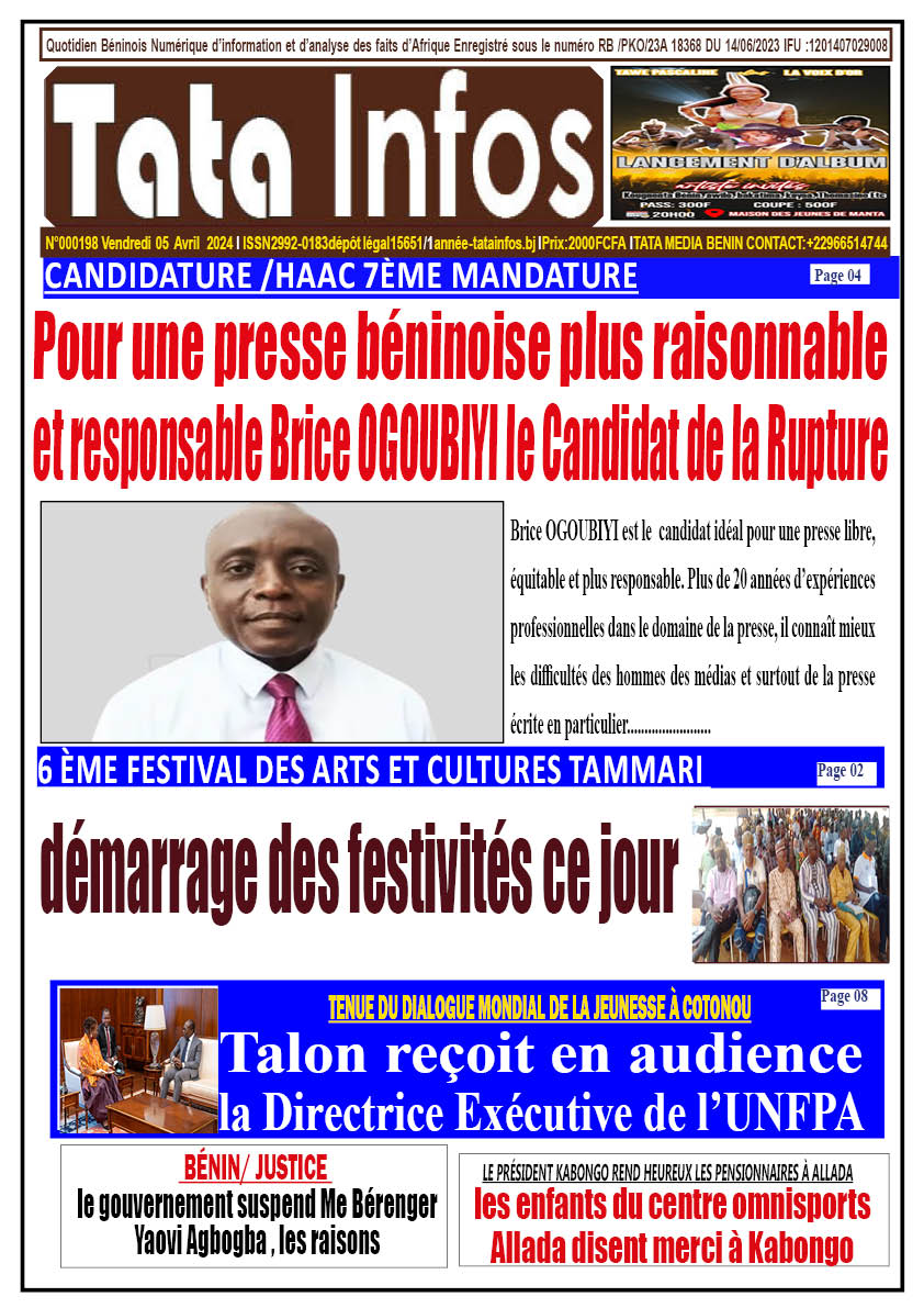 Actualité Revue de presse la une du journal de ce vendredi 05 Avril 2024 tatainfos 5 avril 2024 Spread the love Navigation d’article Précédent L’INFATIGABLE PRÉSIDENT KABONGO RENDS HEUREUX LES PENSIONNAIRES DU CENTRE DE FORMATION T. BERNAERTS SPORT ACADEMY ALLADA JEVSuivant MESSAGE POIGNANT DUNE FEMME, ANCIENNE MINISTRE, DUNE MÈRE Laisser un commentaire Annuler la réponseVotre adresse e-mail ne sera pas publiée. Les champs obligatoires sont indiqués avec *Commentaire * Nom * E-mail * Site web Enregistrer mon nom, mon e-mail et mon site dans le navigateur pour mon prochain commentaire. Δ Histoires connexes Le Nouveau Diplomate, nouveau carrefour du reggae à Parakou ce samedi Actualité Annonces Culture Le Nouveau Diplomate, nouveau carrefour du reggae à Parakou ce samedi 22 janvier 2026 Bénin : 21 nominations prononcées aux ministères de la Justice et du Numérique Actualité Nationale Bénin : 21 nominations prononcées aux ministères de la Justice et du Numérique 21 janvier 2026 Présidentielle au Bénin : les deux duos désormais fixés sur leur position sur le bulletin de vote Actualité Politique Présidentielle au Bénin : les deux duos désormais fixés sur leur position sur le bulletin de vote 21 janvier 2026