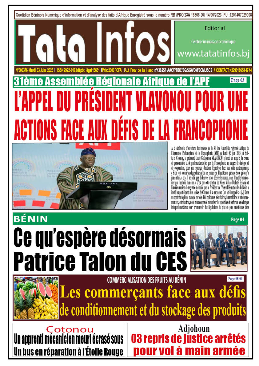 Actualité Revue de presse la une du journal de mardi 03 juin 2025 tatainfos 2 juin 2025 Spread the love Navigation d’article Précédent Cotonou : un apprenti mécanicien meurt écrasé sous un bus en réparation à l’Étoile RougeSuivant CEP 2025 à Parakou : Une mobilisation municipale pour soutenir l’excellence éducative Laisser un commentaire Annuler la réponseVotre adresse e-mail ne sera pas publiée. Les champs obligatoires sont indiqués avec *Commentaire * Nom * E-mail * Site web Enregistrer mon nom, mon e-mail et mon site dans le navigateur pour mon prochain commentaire. Δ Histoires connexes Bénin : 21 nominations prononcées aux ministères de la Justice et du Numérique Actualité Nationale Bénin : 21 nominations prononcées aux ministères de la Justice et du Numérique 21 janvier 2026 Présidentielle au Bénin : les deux duos désormais fixés sur leur position sur le bulletin de vote Actualité Politique Présidentielle au Bénin : les deux duos désormais fixés sur leur position sur le bulletin de vote 21 janvier 2026 LA UNE DU JOURNAL DE CE MERCREDI 21 JANVIER 2026 Actualité Revue de presse LA UNE DU JOURNAL DE CE MERCREDI 21 JANVIER 2026 20 janvier 2026