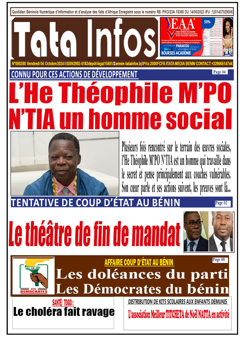 Actualité Revue de presse la une du journal de vendredi 04 octobre 2024 tatainfos 4 octobre 2024 Spread the love Navigation d’article Précédent INFOS KABONGO SPORTSSuivant SAVOIR TOUT SUR L’HOMME : HONORABLE THÉOPHILE M’PO N’TIA Laisser un commentaire Annuler la réponseVotre adresse e-mail ne sera pas publiée. Les champs obligatoires sont indiqués avec *Commentaire * Nom * E-mail * Site web Enregistrer mon nom, mon e-mail et mon site dans le navigateur pour mon prochain commentaire. Δ Histoires connexes Le Nouveau Diplomate, nouveau carrefour du reggae à Parakou ce samedi Actualité Annonces Culture Le Nouveau Diplomate, nouveau carrefour du reggae à Parakou ce samedi 22 janvier 2026 Bénin : 21 nominations prononcées aux ministères de la Justice et du Numérique Actualité Nationale Bénin : 21 nominations prononcées aux ministères de la Justice et du Numérique 21 janvier 2026 Présidentielle au Bénin : les deux duos désormais fixés sur leur position sur le bulletin de vote Actualité Politique Présidentielle au Bénin : les deux duos désormais fixés sur leur position sur le bulletin de vote 21 janvier 2026