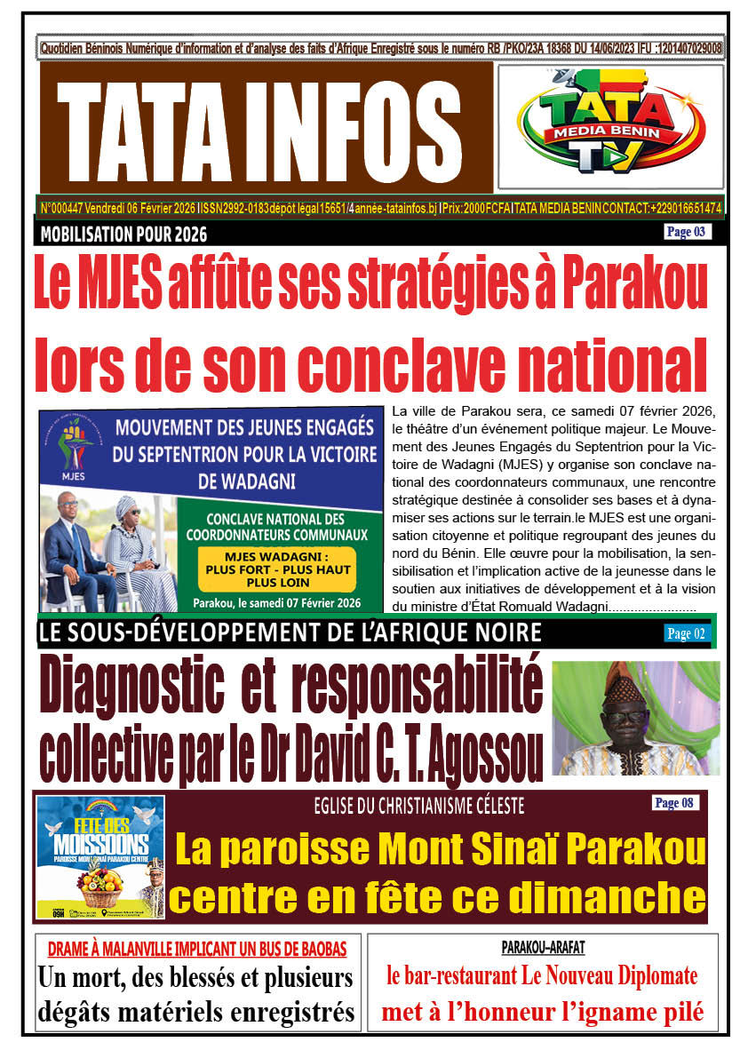 Actualité Revue de presse LA UNE DU JOURNAL DE VENDREDI 06 Février 2026 tatainfos 6 février 2026 Spread the love Post navigation Previous Le Sous-développement de l’Afrique Noire : Diagnostic et Responsabilité Collective Par le Dr David C. T. AgossouNext Sortie officielle du Mouvement d’unité nationale MUN ROW-2026 : rendez-vous ce week-end à Parakou Laisser un commentaire Annuler la réponseVotre adresse e-mail ne sera pas publiée. Les champs obligatoires sont indiqués avec *Commentaire * Nom * E-mail * Site web Enregistrer mon nom, mon e-mail et mon site dans le navigateur pour mon prochain commentaire. Δ Related Stories Sortie officielle du Mouvement d’unité nationale MUN ROW-2026 : rendez-vous ce week-end à Parakou Actualité Nationale Sortie officielle du Mouvement d’unité nationale MUN ROW-2026 : rendez-vous ce week-end à Parakou 6 février 2026 Le Sous-développement de l’Afrique Noire : Diagnostic et Responsabilité Collective Par le Dr David C. T. Agossou Actualité ANALYSES & INTERVIEWS INVESTIGATIONS & REPORTAGES Nationale Le Sous-développement de l’Afrique Noire : Diagnostic et Responsabilité Collective Par le Dr David C. T. Agossou 6 février 2026 Parakou accueille le conclave national du MJES : les jeunes engagés renforcent leur mobilisation autour de Wadagni Actualité Nationale Politique Parakou accueille le conclave national du MJES : les jeunes engagés renforcent leur mobilisation autour de Wadagni 6 février 2026